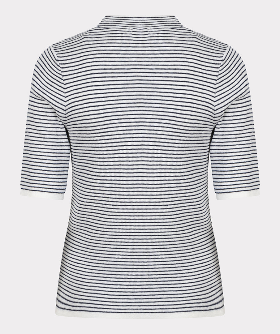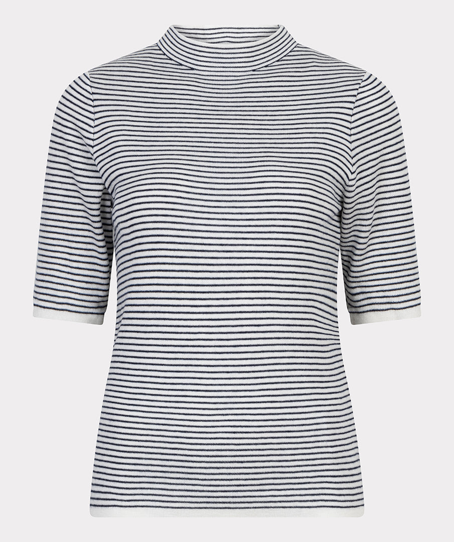 Mock neck knit top in a classic stripe featuring elbow length short sleeves.