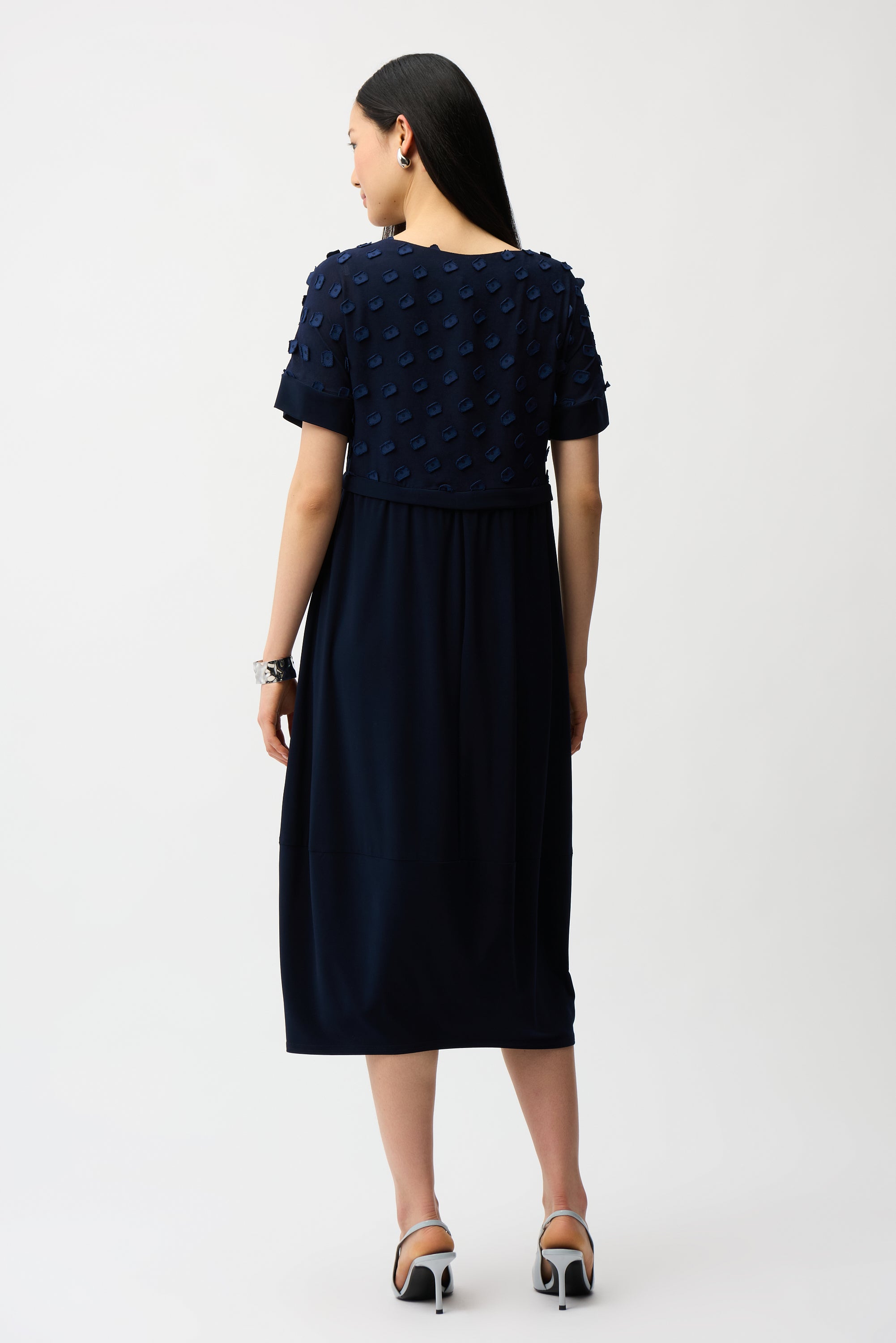 Step into style with this Joseph Ribkoff A-line midi dress. Perfect for both casual and semi-formal occasions, this dress features a flattering round-neck and eye-catching jewel embellishments. The plain pattern and puff short-sleeves add a feminine touch, making it a versatile addition to any wardrobe.