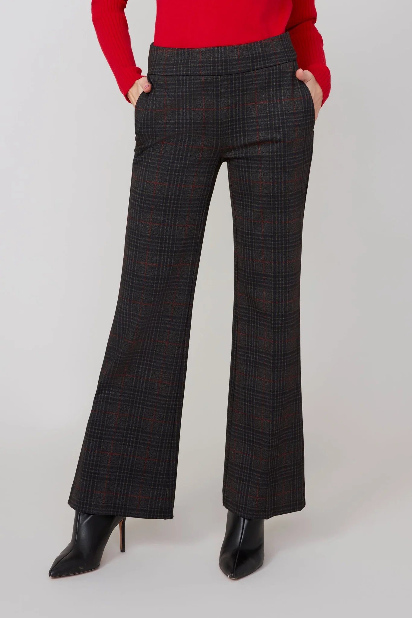 Wide leg pull-on pants with with 4 pocket construction in a subtle plaid.