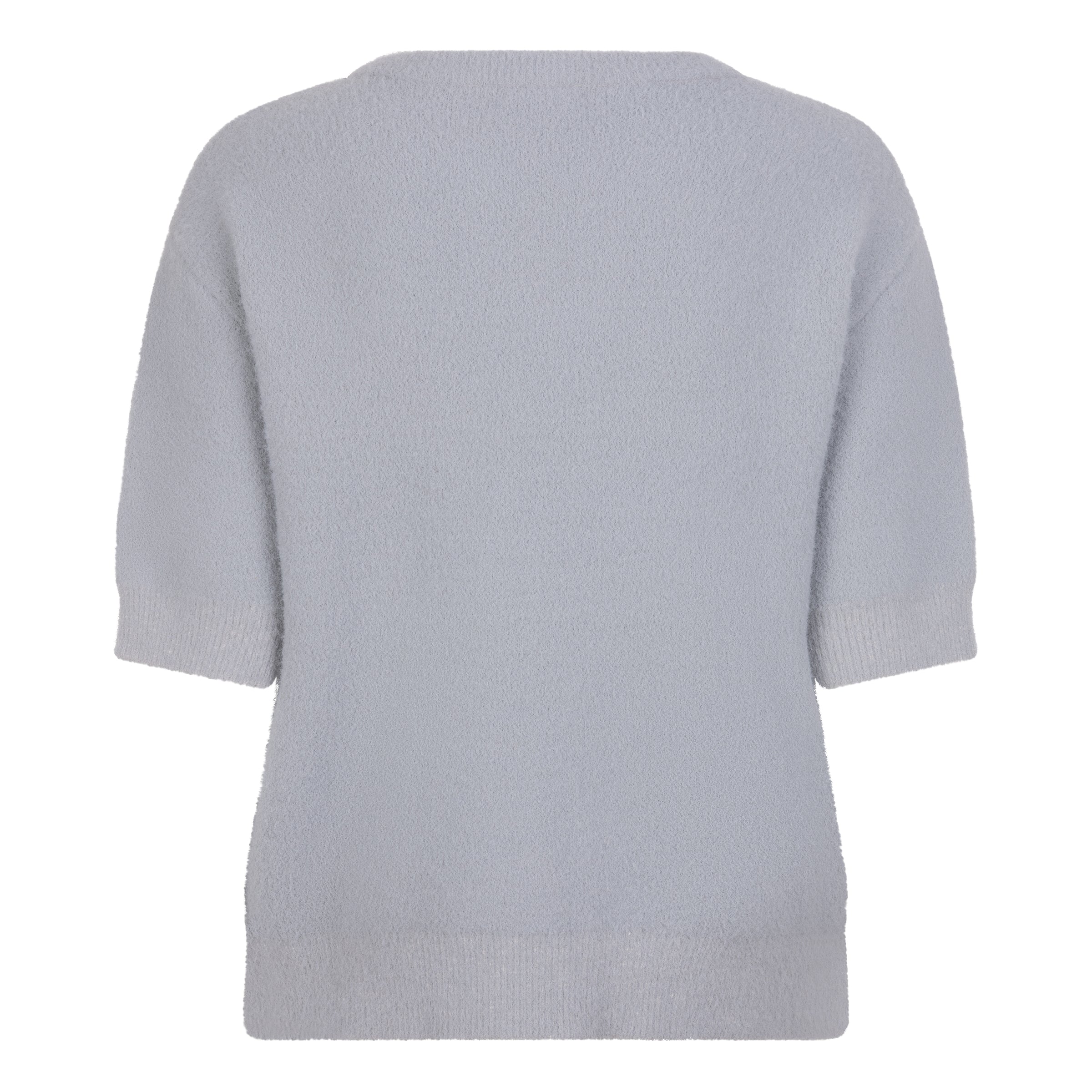 A knit sweater with elbow length sleeves, felt-like finish and sparkle detail around the neck.